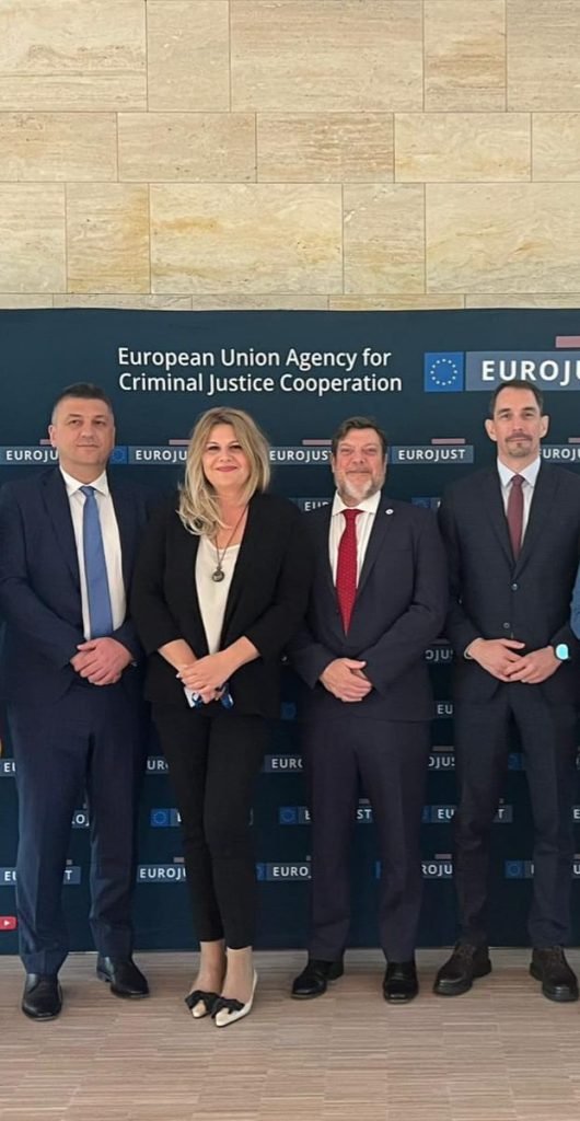 Unapređenje pružanja međunarodne pravne pomoći u krivičnim stvarima od značaja je za djelotvornije postupanje Državnog tužilaštva – ocijenili su vrhovni državni tužilac Milorad Marković, glavni specijalni tužilac Vladimir Novović i državna tužiteljka za vezu sa EUROJUST-om Jelena Đaletić, na sastanku sa sekretarom Evropske pravosudne mreže (EJN) Hjuom Dokrijem, održanom u Hagu, tokom radne posjete EUROJUST-u.